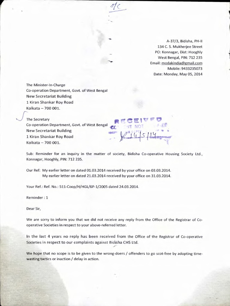 Complaint Letter Submitted To The Deputy Registrar Of Co Operative Societies Government Of West Bengal On Monday 14 May 2012 Judiciaries Crime Thriller